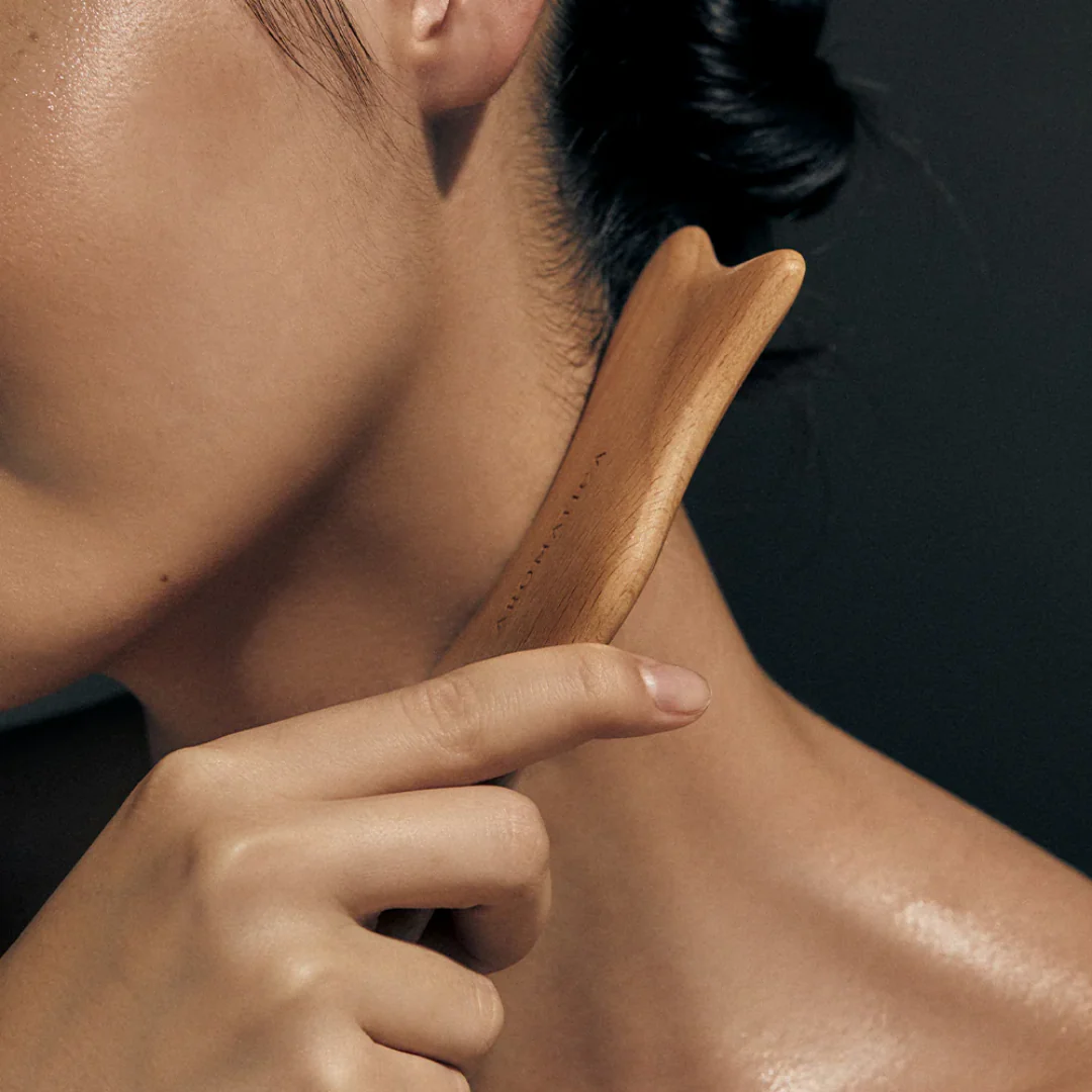 Holz‑Massagewerkzeug in Form eines Delfins, das Gesicht und Körper sanft massiert, die Lymph‑ und Blutzirkulation fördert und für entspannte Muskulatur und definierteren Teint sorgt.